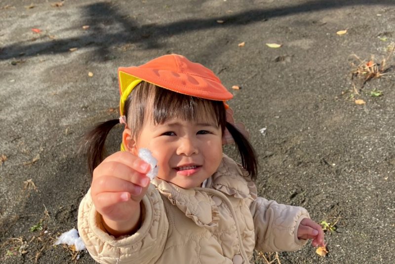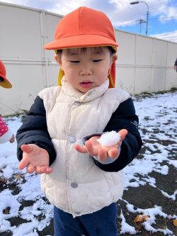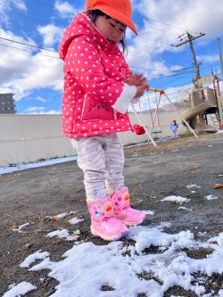つめた〜い!といいながら雪を握ってみたり、靴で踏んで感触を楽しんだりしていました!